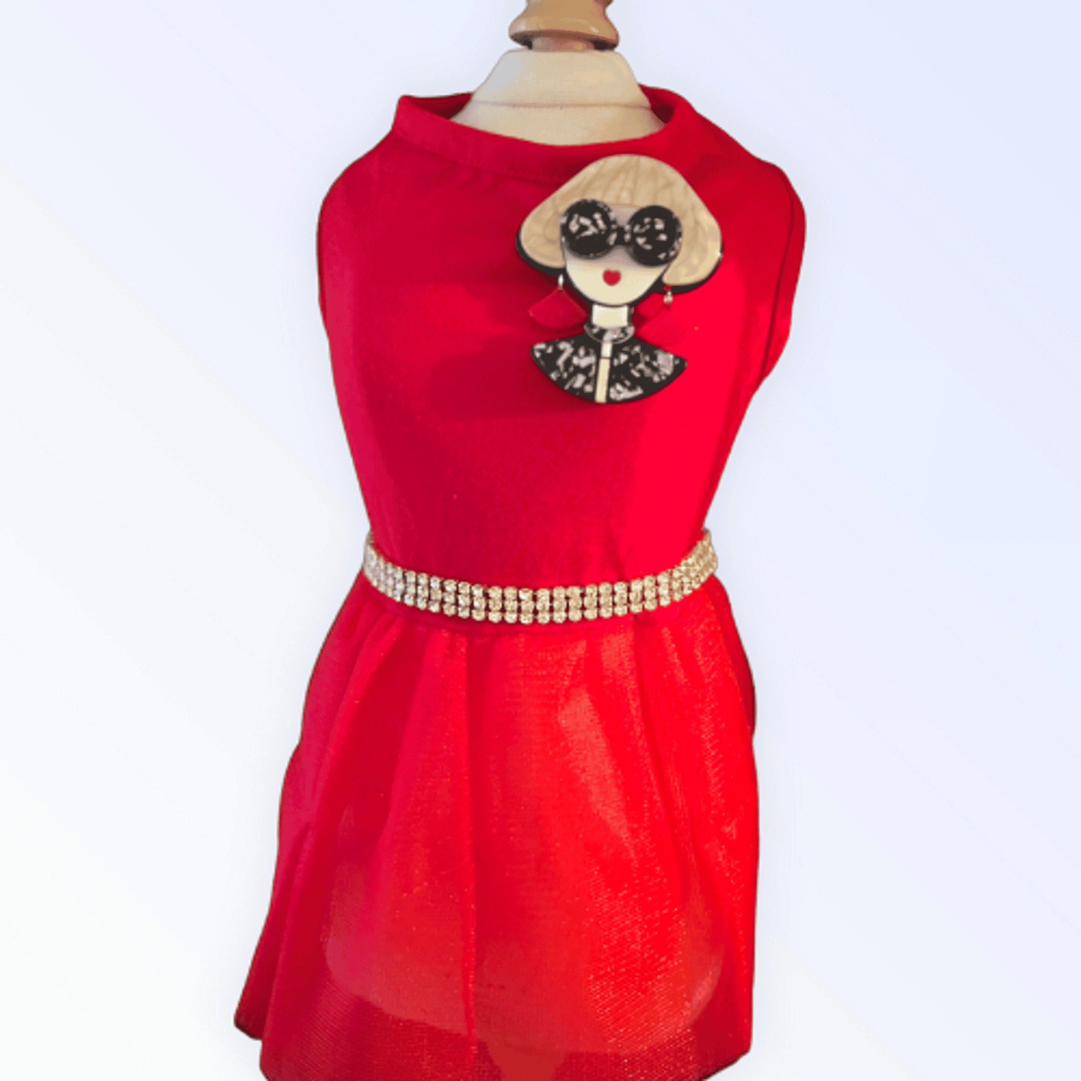 Fashion-forward pups love designers, too! This dress is sure to impress! A poly/cotton sleeveless shirt with a cute ruffle sewn onto the bottom to give this dress some adorable flair! These outfits are double-stitched in all the right places to provide not just durability, but a level of comfort that dogs will appreciate. Plus, they are pretty fabulous! Features a beautiful acrylic brooch.