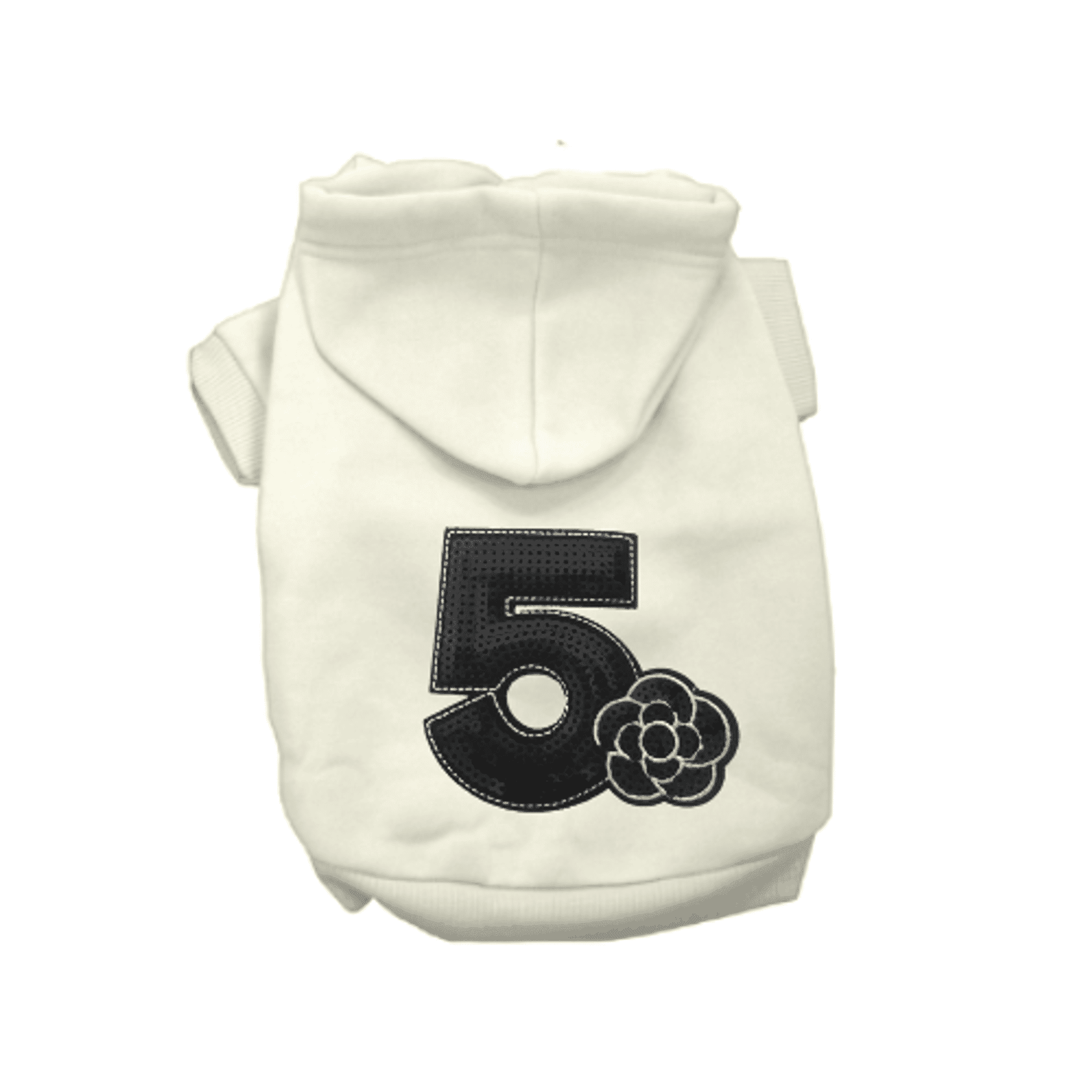 Fashion-forward pups love designers, too! A designer-inspired logo on a shirt or dress is sure to impress!Features a GORGE sequined No. 5 applique'.These poly/cotton sleeved hoodies are perfect for cold-weather days. Double-stitched in all the right places for durability and has a super soft interior for extra comfort. Includes a slit so a leash can be clipped onto a collar or harness if worn underneath.